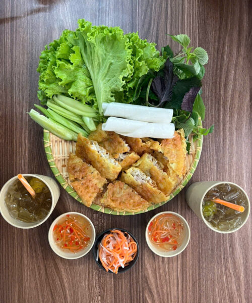 - Option 2: Bánh Xèo. Savor the crispy, savory pancake filled with shrimp, bean sprouts, and herbs, served with a flavorful dipping sauce.